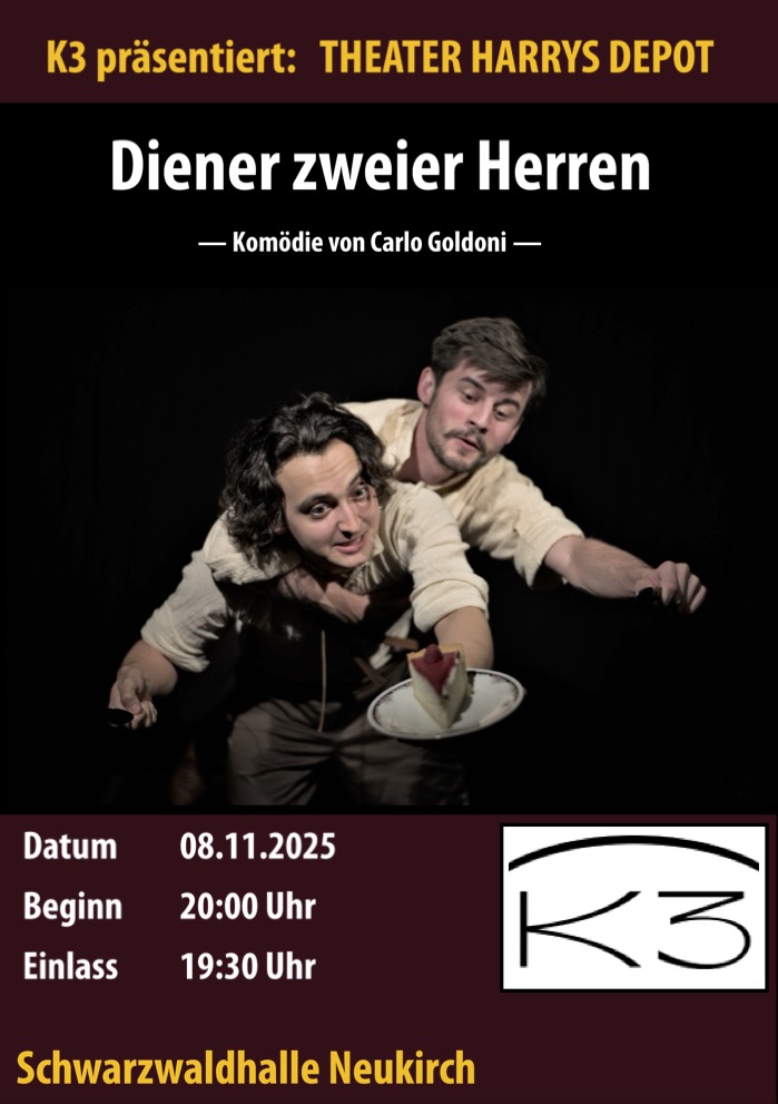 um ihren Geliebten Florindo zu finden. Der ist auf der Flucht vor der Justiz. Beide landen zufällig im selben Gasthof und träfen dort aufeinander — wenn es der pfiffige Diener Trualdino nicht verhinderte. Getrieben von Hunger und Geldnot verpichtet er sich heimlich bei beiden „Herren“ gleichzeitig. Mit schrägen Einfällen und halsbrecherischen Ausreden versucht er beharrlich, deren Identitäten voneinander zu verbergen. So bewegen sich die Figuren durch eine turbulente Geschichte