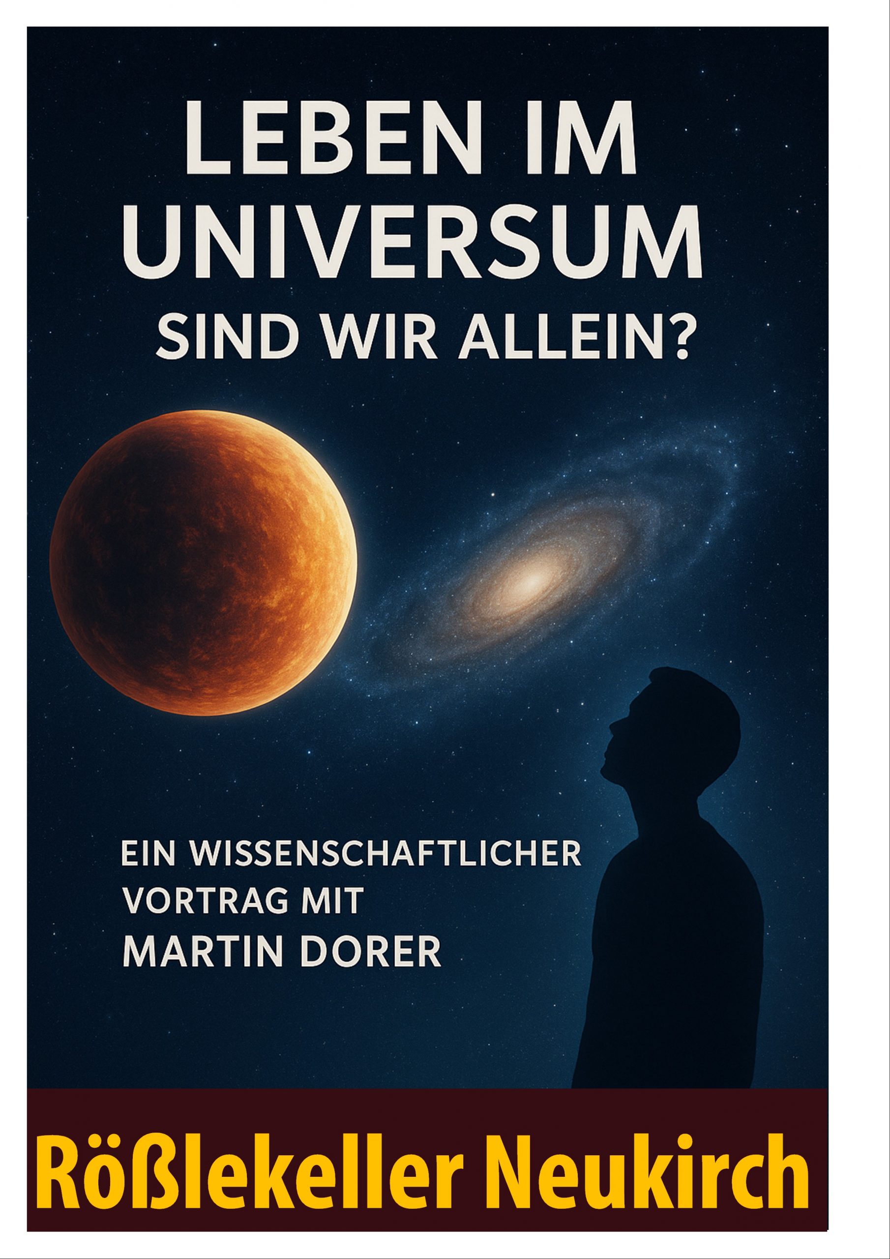 Seit Jahrhunderten fasziniert die Menschheit die Frage, ob wir allein im Universum sind – oder ob es irgendwo da draußen noch anderes Leben gibt. In diesem ca. 1,5-stündigen Vortrag nimmt Martin Dorer Sie mit auf eine spannende Reise durch die moderne Astronomie und Astrobiologie, auf der Suche nach Antworten auf eine der größten Fragen der Wissenschaft.